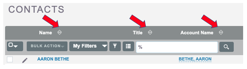 In any list view, you can sort the list by Column name by clicking on the "up/down arrow" in the header next to each column header.